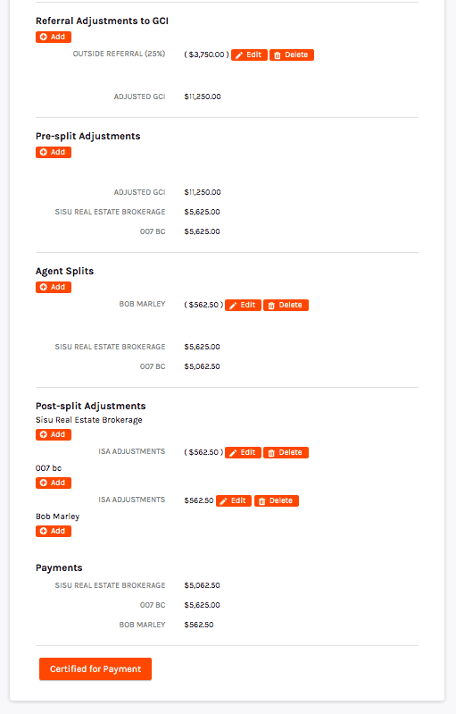Once you've gotten all the numbers straight, go ahead and hit "certified for payment". This will adjust the database so that the correct numbers for agent paid income and team income are reflected across the platform. The transaction will then be locked so that only admin accounts can edit it.