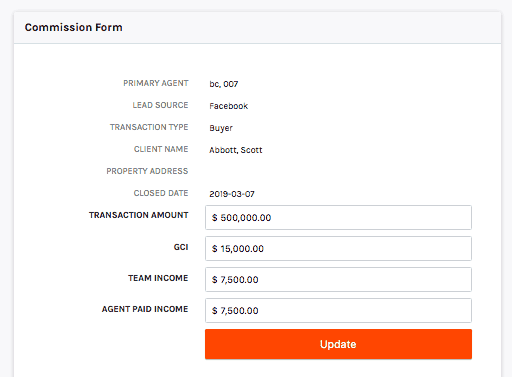 Once the deal closes, it's everyone's favorite time: time to get paid. At this point, we're looking for a few specific points of data; who are the agents on the deal, how much will they get paid, and what will the organization take away as profits or income to help cover their expenses?
